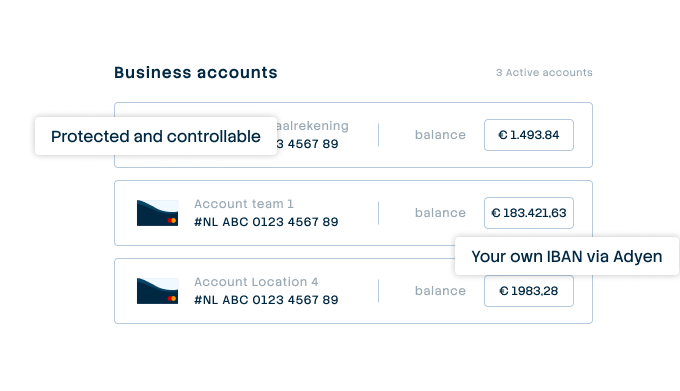 Choose one or more Dutch IBANs provided by Adyen, linked to all your cards and payment flows. Simple management without complex multi-account structures that cause confusion.