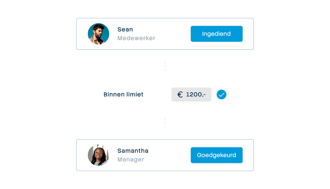 Na een betaling of declaratie ziet de medewerker direct de status: al goedgekeurd of wie er nog naar moet kijken. Bij afwijzing komt er een melding met de reden. Bij goedkeuring gaat de administratie automatisch naar je boekhouding met de juiste kostenplaats en grootboekrekening.